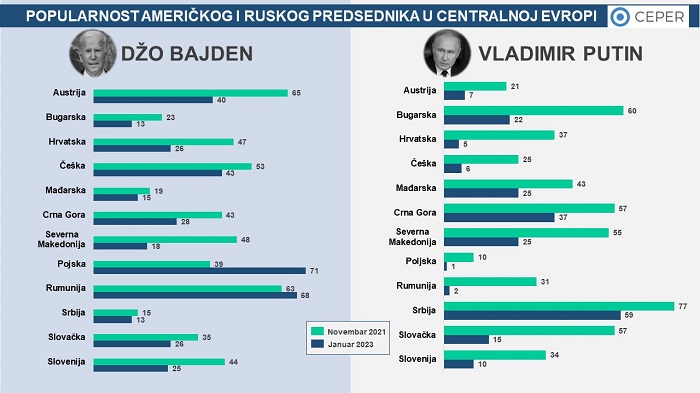 popularnosti predsednika Rusije Putina i predsednika SAD Bajdena u Centralnoj Evropi.