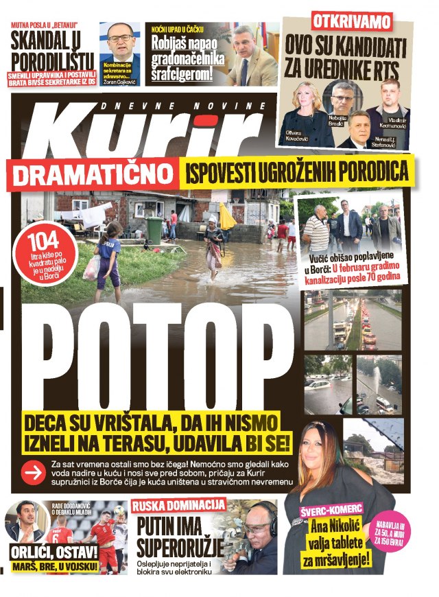 VUČIĆ U POTOPLJENOJ BORČI OBEĆAO KANALIZACIJU – Predsednik Srbije Aleksandar Vučić posetio je Borču, beogradsko naselje koje je poplavljeno posle nevremena u nedelju popodne, i najavio od marta iduće godine izgradnju kanalizacije za naselja na levoj obali Dunava.