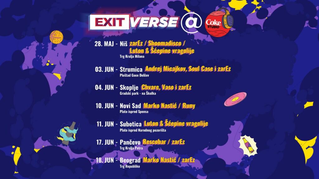 EXITVERSE @ Coke Studio turneja startuje u subotu, 28. maja u Nišu, dok za vikend stiže i u Severnu Makedoniju, gde je 3. jun rezervisan za Strumicu, a 4. jun za Skoplje. Turneja se nastavlja u Novom Sadu 10. juna, u Subotici 11. juna, i u Pančevu 17. juna, dok će završna stanica biti Beograd, u nedelju, 18. juna.