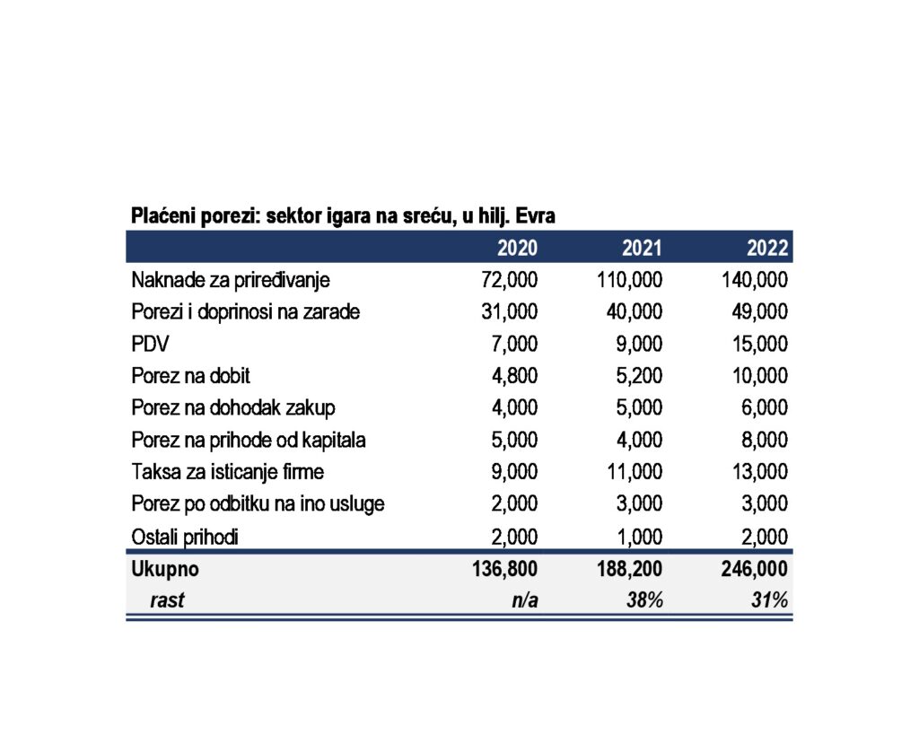 Ukupan neto profit industrije igara na sreću za 2022. godinu iznosio je 100 miliona, što znači da su priređivači u budžet naše zemlje uplatili 2,5 puta više od ukupnog prihoda koji su ostvarili.