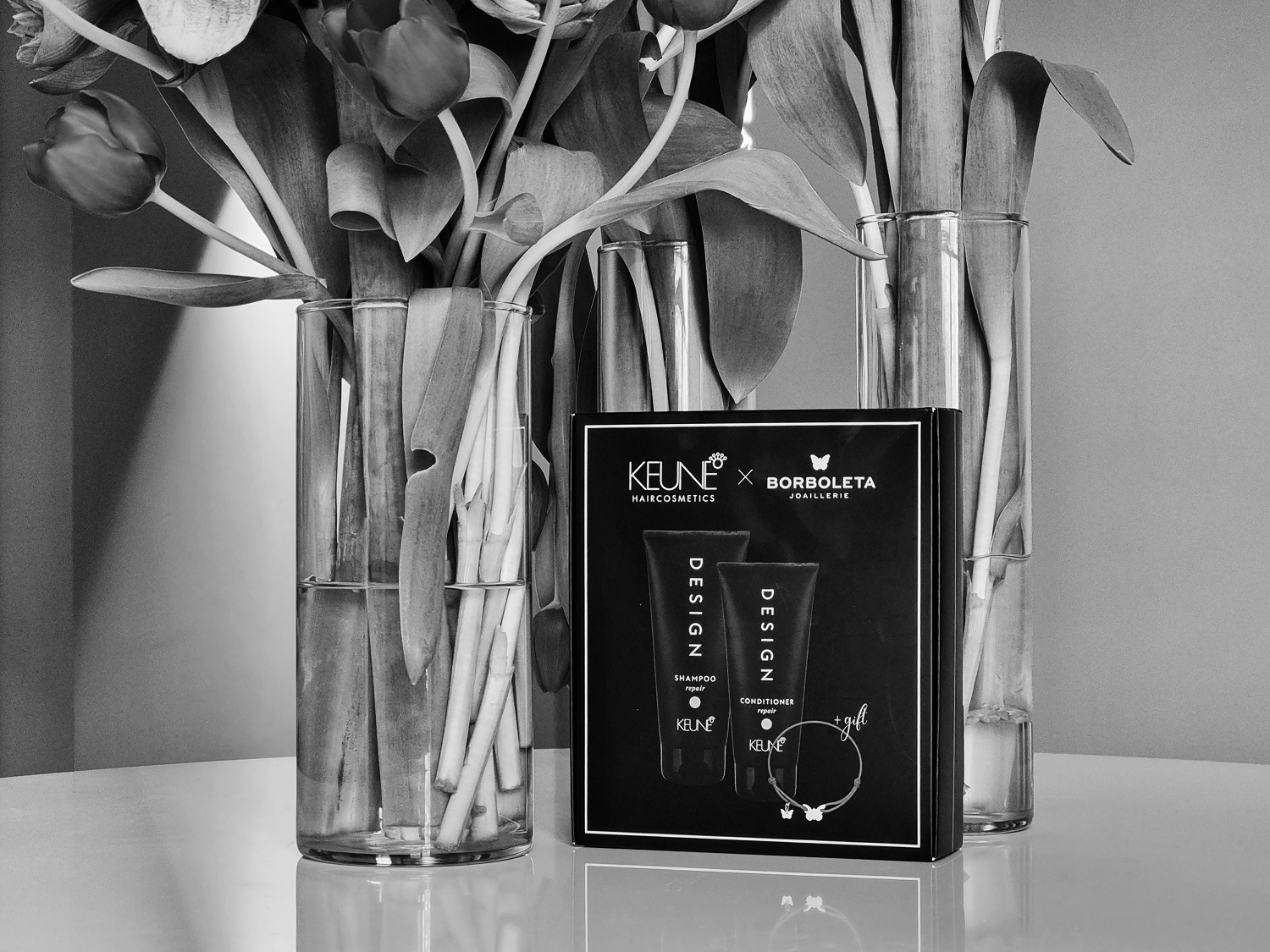 Kutija Keune x Borboleta donosi spoj sjajne nege kose i besprekornog stila. U elegantnoj crnoj kutiji zapakovani su Design by Keune šampon i regenerator, a u svakom pakovanju se nalazi i poklon, među trendsetericama veoma popularna narukvica brenda Borboleta.