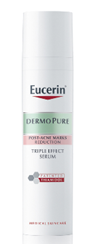 Nakon čišćenja, ujutru i uveče, na kožu nanesite Eucerin®DermoPURE Serum sa trostrukim efektom koji klinički dokazano umanjuje uporne tamne fleke od akni, efikasno ublažava simptome masne i problematične kože i pruža koži dugotrajni mat izgled. Ublažavanje upornih tamnih fleka od akni i sprečavanje njihovog ponovnog nastanaka u formulaciji ovog preparata obezbeđuje Eucerin® patentirani Thiamidol®. Dodatno, formulacija ovog preparata sadrži salicilnu kiselinu, koja efikasno umanjuje pojavu simptoma masne i problematične kože, i likokalkon A, koji deluje protivupalno. Pored toga, sebum regulatorna tehnologija primenjena u formulaciji Eucerin®DermoPURE Seruma sa trostrukim efektom, smanjuje lučenje sebuma i pruža koži dugotrajan mat izgled.