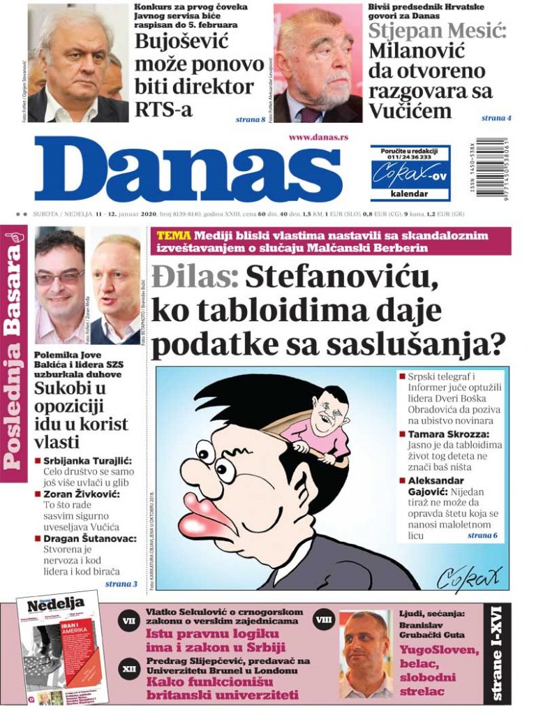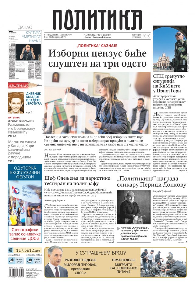 POLITIKA: CENZUS ĆE BITI SPUŠTEN NA 3 ODSTO – Na predstojećim parlamentarnim i lokalnim izborima, koji će najverovatnije biti održani 26. aprila ili 3. maja, za osvajanje skupštinskih mandata biće potrebno samo tri odsto glasova izašlih birača, piše Politika u izdanju od subote, 11. januara 2020. godine.