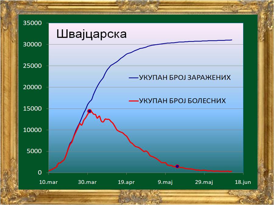 Švajcarska je u boljoj situaciji. Maksimalni broj bolesnih (14.349) dostignut je ranije, a sada je njihov broj već opao ispod 2 % maksimalnog. Ukupan broj zaraženih je skoro dva puta veći nego u Austriji, ali je njegov apsolutni porast znatno sporiji (prosečno oko 17 osoba dnevno), što nagoveštava da je Švajcarska bliže kraju.