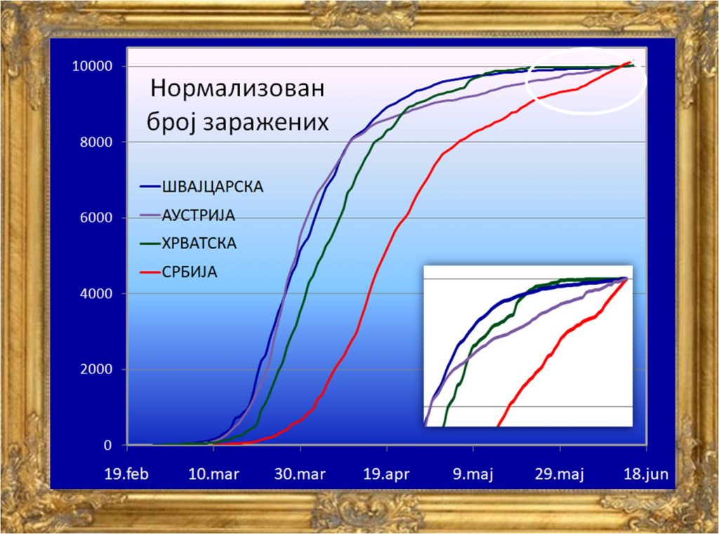 Na ovoj slici nalazi se i dijagram Srbije (označen crvenom bojom). On kaska iza tri prethodna. Zaostaje nekih dvadeset dana. Doduše, krenuo je deset dana kasnije, 6. marta, ali u ovom trenutku nema pojave zasićenja krive ukupnog broja zaraženih. Taj broj neumitno raste. U prvoj polovini juna prosečno za 64 osoba dnevno. Relativan nagib otprilike odgovara nagibu koji je 22. aprila imala normalizovana kriva Švajcarske. Kada će Srbija doći do završne faze (što podrazumeva da dijagram broja zaraženih trajno bude u zasićenju, a broj bolesnih manji od, na primer, 1% najvećeg registrovanog broja) ne zna se. Najverovatnije, to neće biti uskoro.