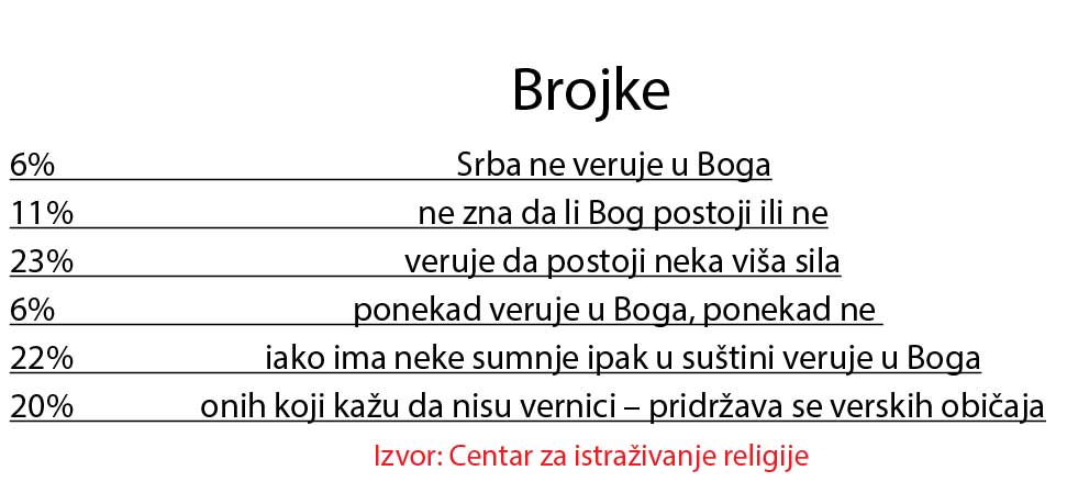 Negde između molitve i solidarnosti sa jedn, i zatamnjenih stakala, cenovnika i nedostatka odgovornosti sa druge strane, javlja se pitanje – zašto se Srbi deklarišu kao vernici? Ili makar zašto to rade oni koji ne odlaze u crkvu, ili u nju nemaju poverenje, ili naprosto nisu sigurni u postojanje određenih religijskih kategorija koje verujući ne bi trebalo da dovode u pitanje.