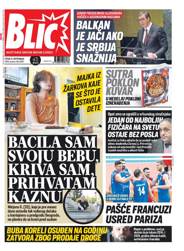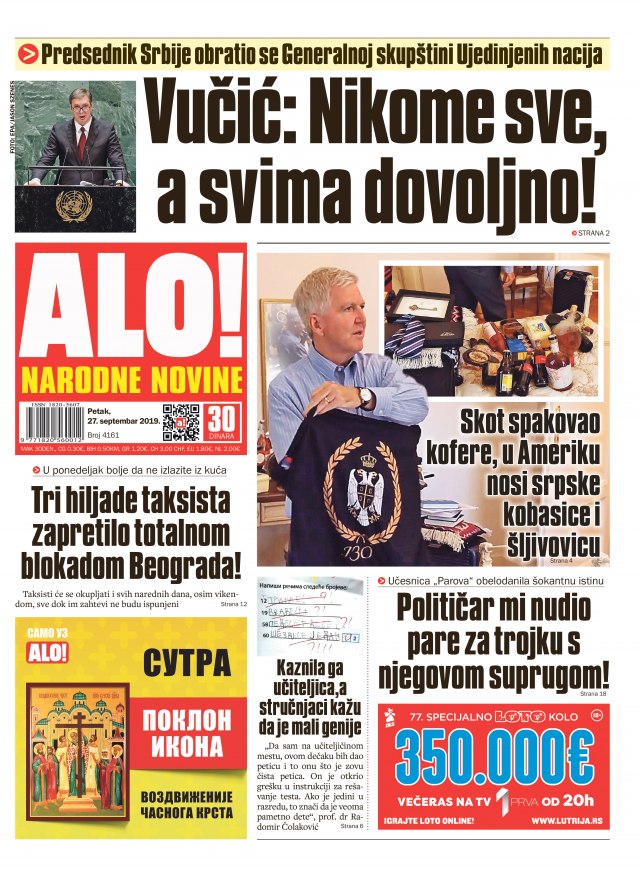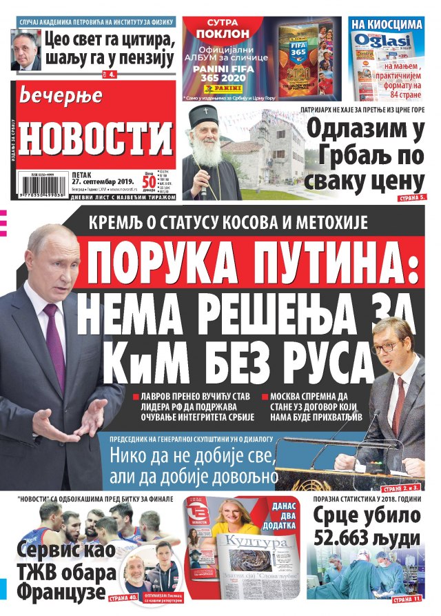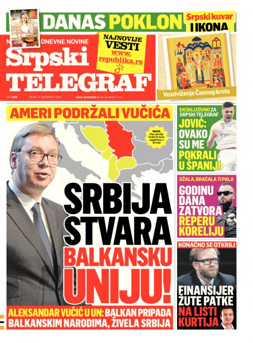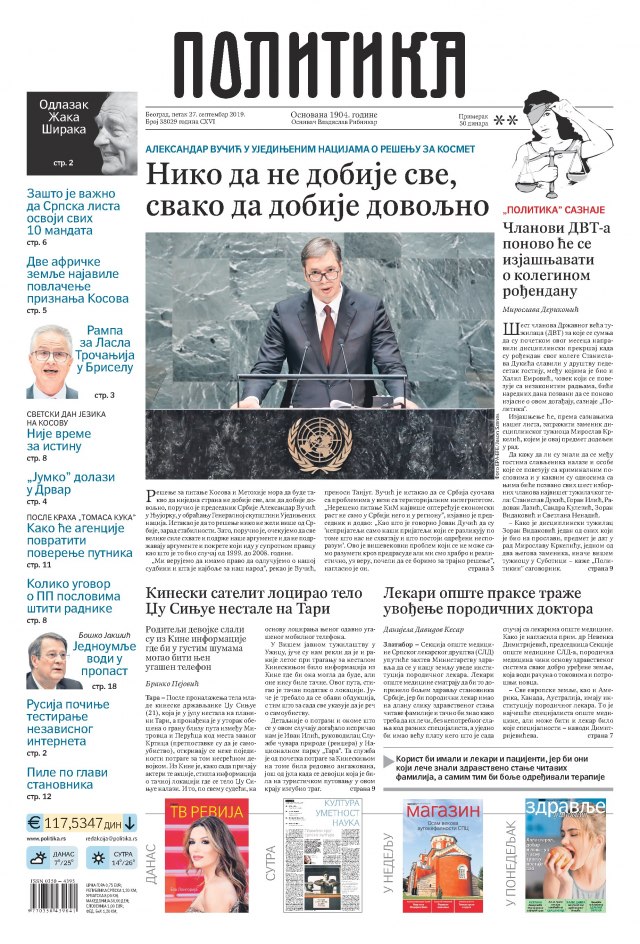 VUČIĆ U UN – Predsednik Srbije Aleksandar Vučić izjavio je na zasedanju Generalne skupštine Ujedinjenih nacija u Njujorku da nerešeno pitanje Kosova i Metohije opterećuje ekonomski rast ne samo mladih u Srbiji, već i u regionu i da trajno rešenje mora da bude postignuto tako da nijedna strana neće dobiti sve, ali će dobiti dovoljno.