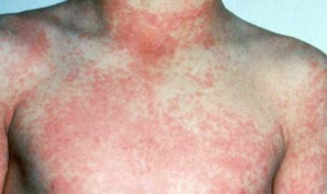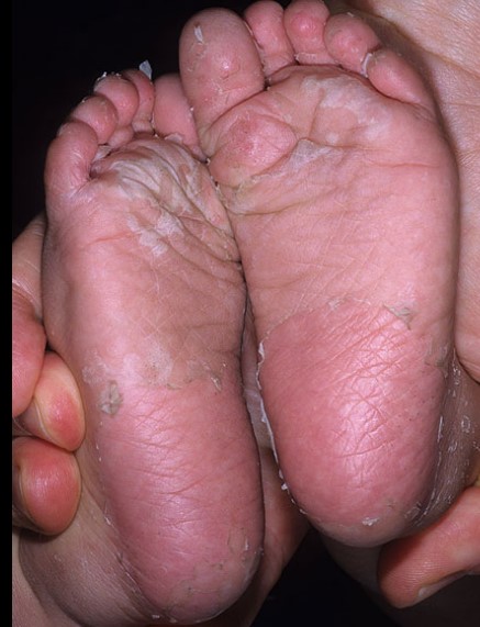 2. Osipni stadijum – Osip se javlja prvo na koži vrata, predelu aksile, ingvinumu i širi se prema ekstremitetima. Ospa je makulopapulozna na hiperemičnoj koži. Koža je suva, gruba, kao naježena. Ne javlja se na licu, dlanovima i tabanima. Najintezivnija je na velikim pregibima, fleksornim stranama ekstremiteta. Praćena je lakim svrabom.