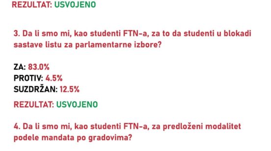 Društvo Politika Plenum FTN iz Novog Sada traži vanredne izbore i da studenti u blokadi sastave parlamentarnu listu Milica Levajac