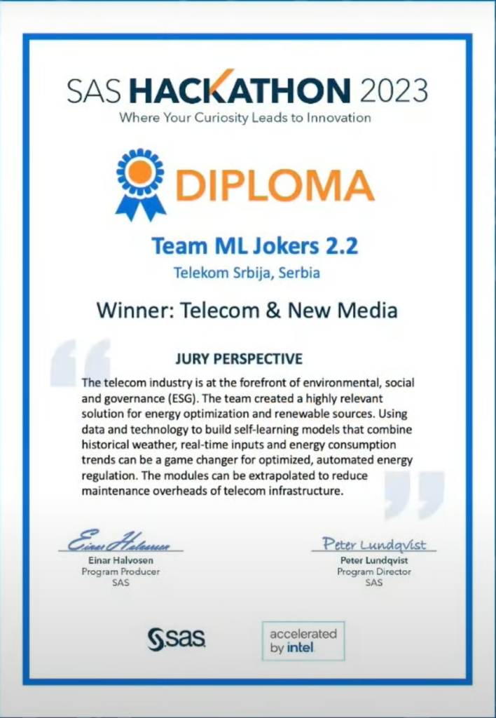 „Telekom Srbija kao najveći nacionalni operator i društveno odgovorna kompanija, posvećen je sprečavanju, kontroli i smanjenju svih oblika zagađivanja životne sredine i održivom korišćenju prirodnih resursa. U skladu sa tim smo se odlučili da na SAS hakatonu razvijemo rešenje koje će doprineti održivosti životne sredine, efikasnijem korišćenju prirodnih resursa i boljim uslovima za naše zaposlene. Zaista smo srećni da je žiri prepoznao značaj projekta u veoma oštroj konkurenciji timova iz celog sveta” izjavila je Natali Delić, Izvršna direktorka za strategiju i digital u Telekomu Srbija.