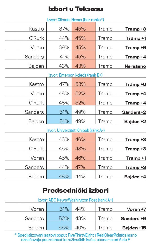 Ako se pouzdamo samo u one koje imaju ocene A i B, poput Emerson koledža, YouGova i Univerziteta Kinipek, samo Sanders i Bajden mogu, makar u ovom trenutku, da računaju na otimanje Teksasa, koji je glasao republikance na svim predsedničkim izborima od 1976. naovamo. Pre tri godine, Tramp je odneo 36 elektorskih glasova sa 52,23 odsto, dok je Hilari Klinton imala 43,24 odsto.
