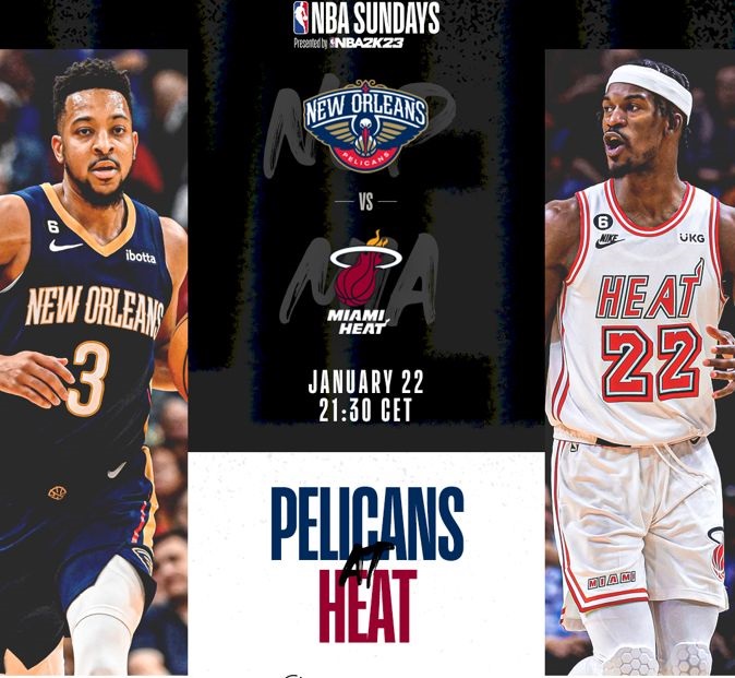 U Miami-Dade Areni na Floridi ekipa Hita dočekuje Pelekanse. Tim iz Majami je ubedljivo pobedio 19. januara u Nju Orleansu, tako da se očekuje uzbudljiv revanš i okršaj dva vrsna strelca, niskog krila Hita Džimija Batlera i beka Pelikansa Kristiana Džejmsa MekKoluma.