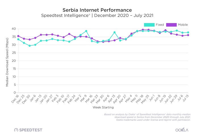 Od ovog septembra, Srbija se po prosečnim brzinama preuzimanja podataka sa mobilnih uređaja nalazi na 52. mestu svetske liste zemalja, sa prosečnom brzinom od 53,82 Mbps, a kada je reč o fiksnom, širokopojasnom internetu, zauzela je 54. mesto sa 86,77 Mbps. Iako je u istom rangu sa pojedinim državama iz regiona, kao što su Crna Gora i Bosna i Hercegovina, ipak zaostaje za drugim tržištima u okruženju gde je započetak komercijalna upotreba 5G mreže. Tako na primer, Bugarska i Hrvatska beleže srednje brzine preuzimanja veće od 100 Mbps.