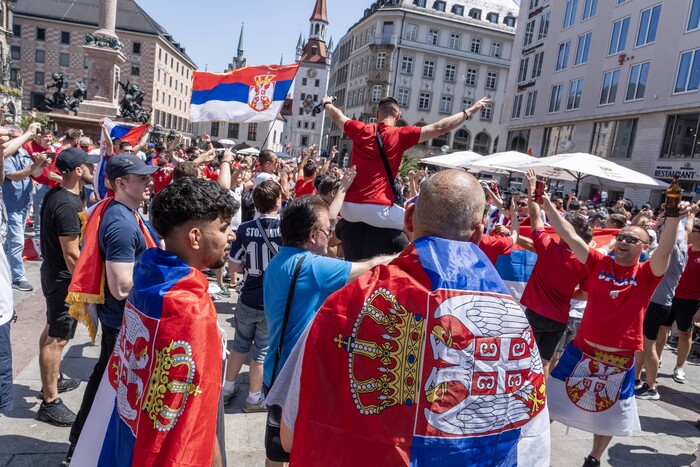 Zagrevanje za utakmicu trećeg kola između Srbije i Danske je u toku, a dok se igrači spremaju za meč na terenu i u teretani, navijači obe reprezentacije okupirali su ulice Minhena gde u karnevalskoj atmosferi čekaju da se otvore kapije Alijanc Arene.