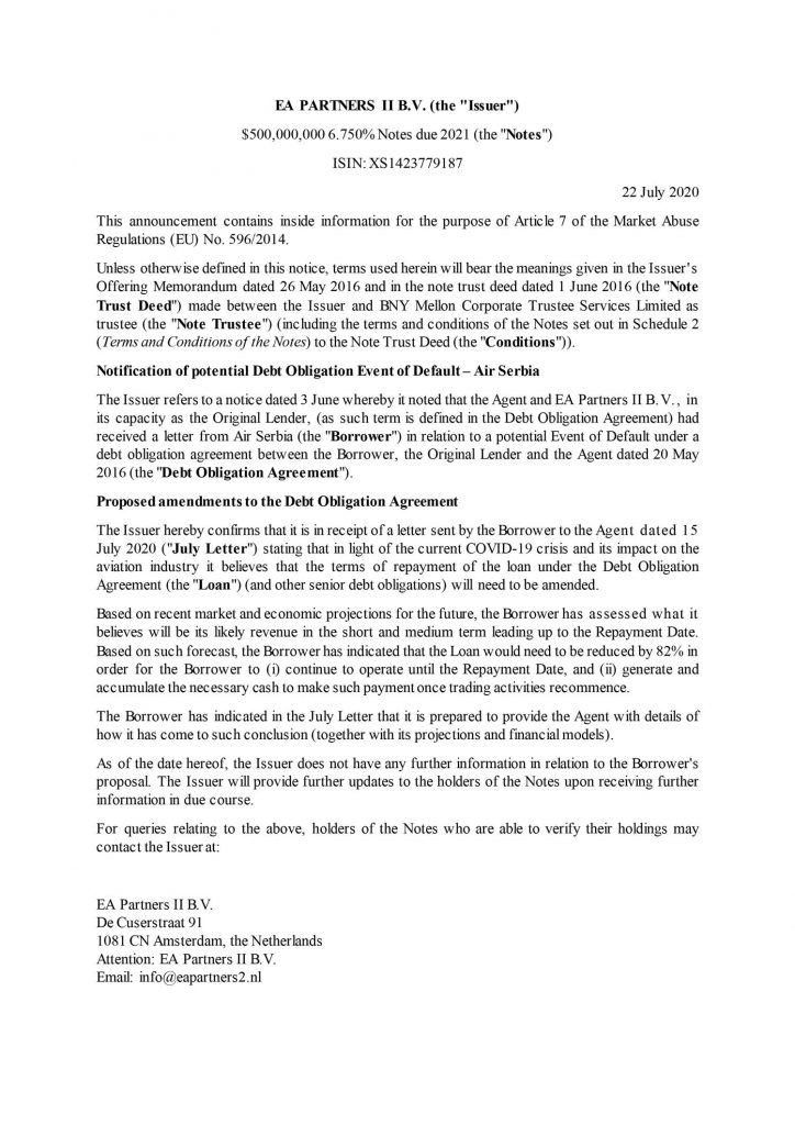 Etihad Airways partners BV (EAP BV) fond je prošlog meseca istakao da je Air Serbia “spremna da se uključi u smislene diskusije kako bi se postigao prihvatljiv dogovor”.