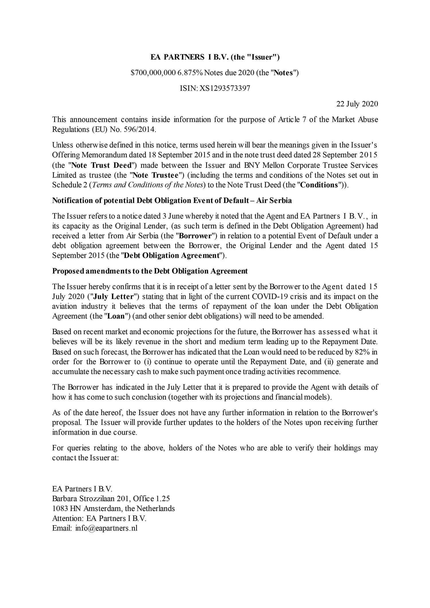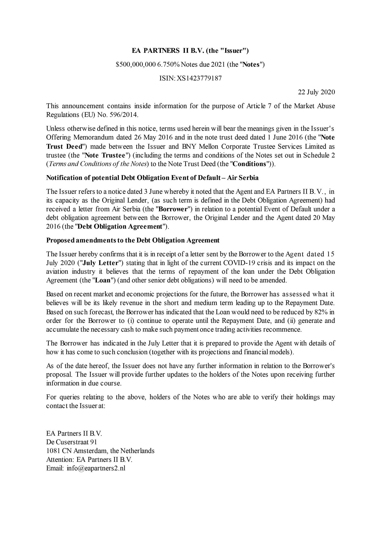 Na osnovu nedavnih tržišnih i ekonomskih projekcija za budućnost, Air Serbia je zatražila, a na osnovu analize planiranih prihoda u kraćem i srednjem periodu, da se dug smanji za 82 odsto.