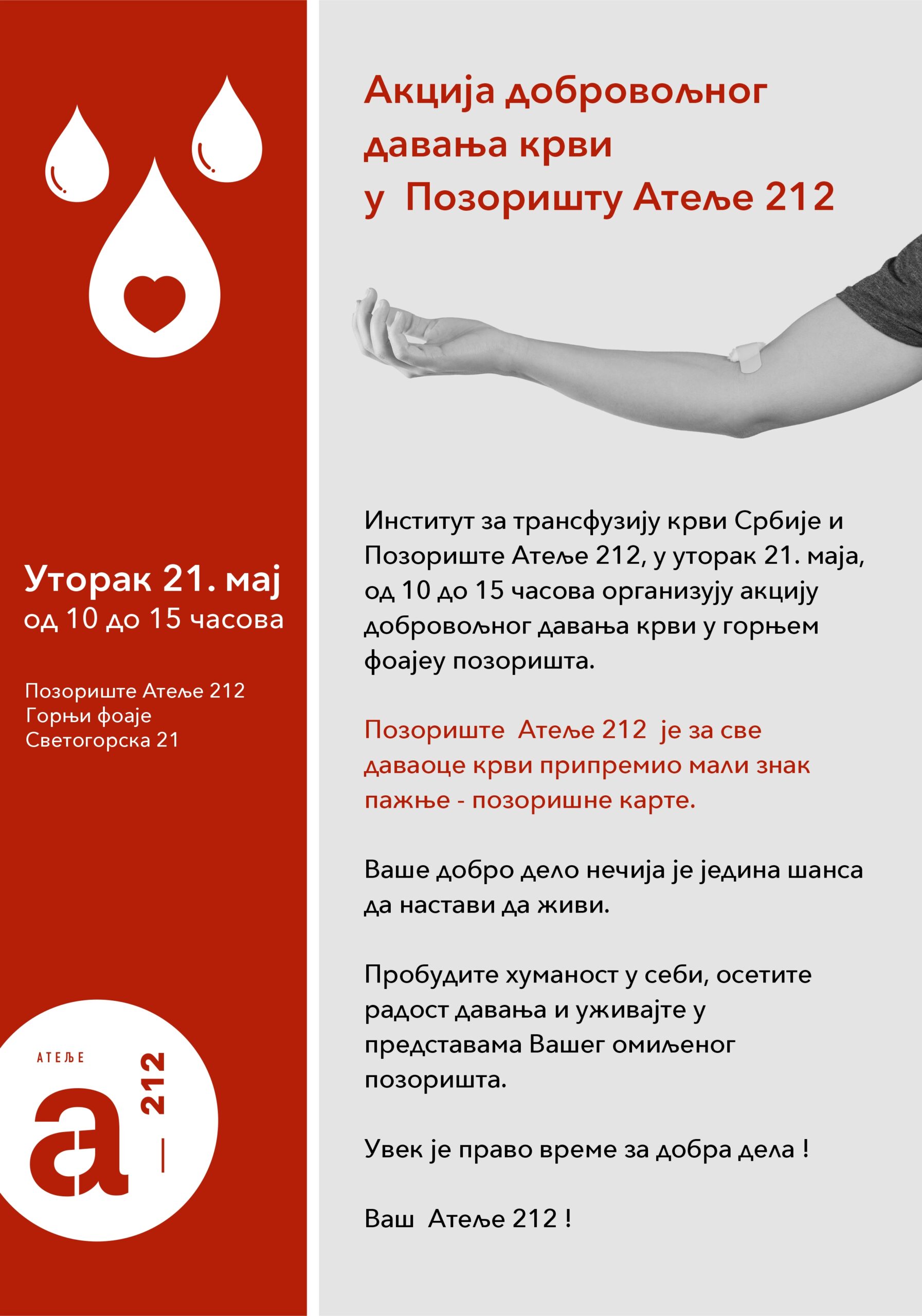 Institut za transfuziju krvi Srbije i Pozorište Atelje 212, u utorak 21. maja, od 10 do 15 časova organizuju akciju dobrovoljnog davanja krvi u foajeu pozorišta na prvom spratu.