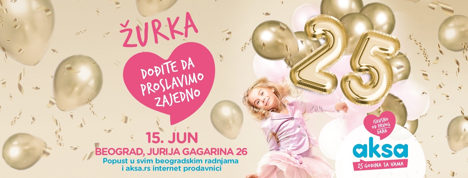Ove godine Aksa slavi 25. rođendan i tom prilikom vas poziva na veliku žurku na dve lokacije – Aksa prodavnici Jurija Gagarina 26 i Nikolaja Gogolja 17 (Banovo brdo) u subotu 15.06.2019. od 10 časova!
