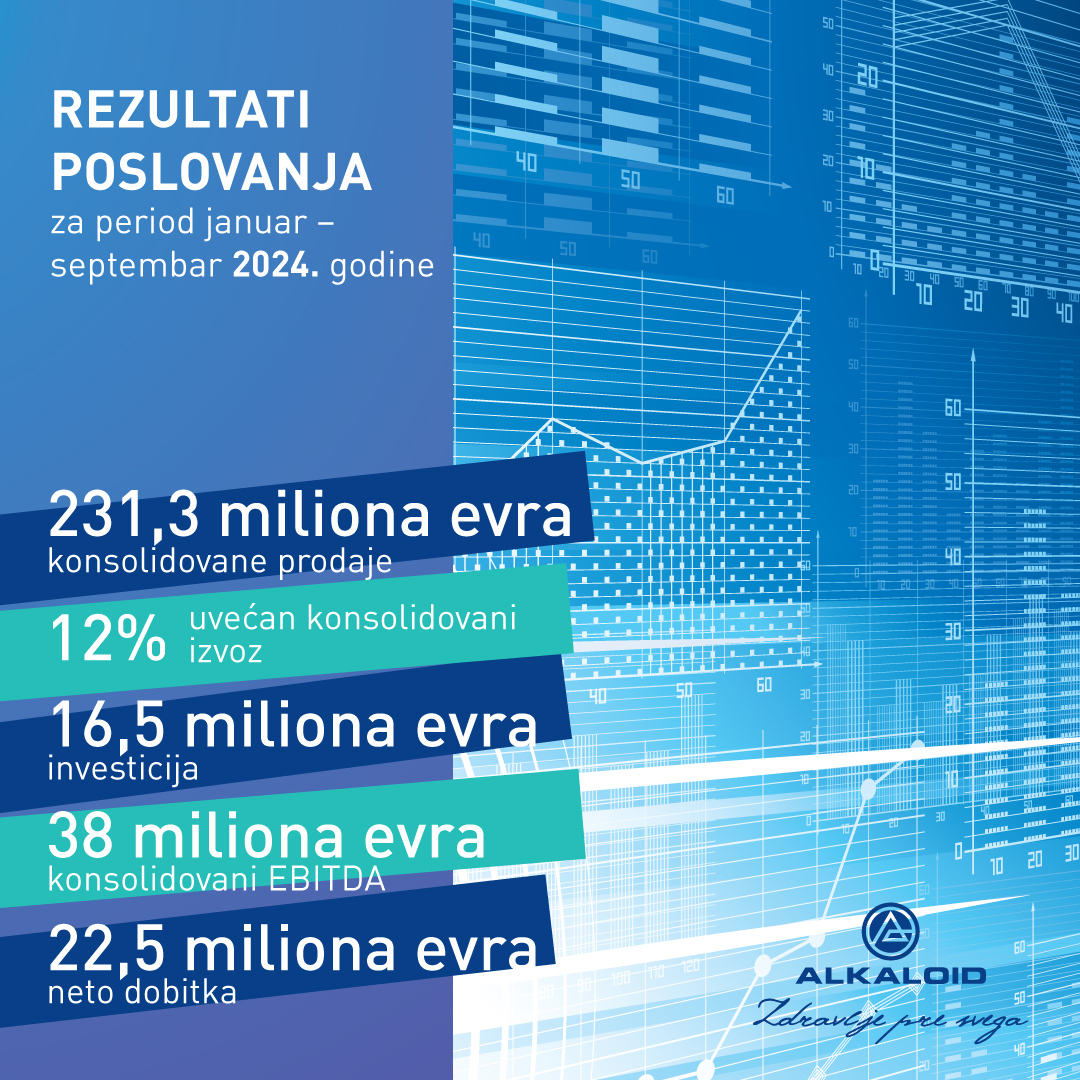 ALKALOID sa konsolidovanim rastom prodaje od 14% u vrednosti od 231,3 miliona evra, konsolidovanom neto dobiti od 22,5 miliona evra i ulaganjima od 16,5 miliona evra u periodu januar- septembar 2024.