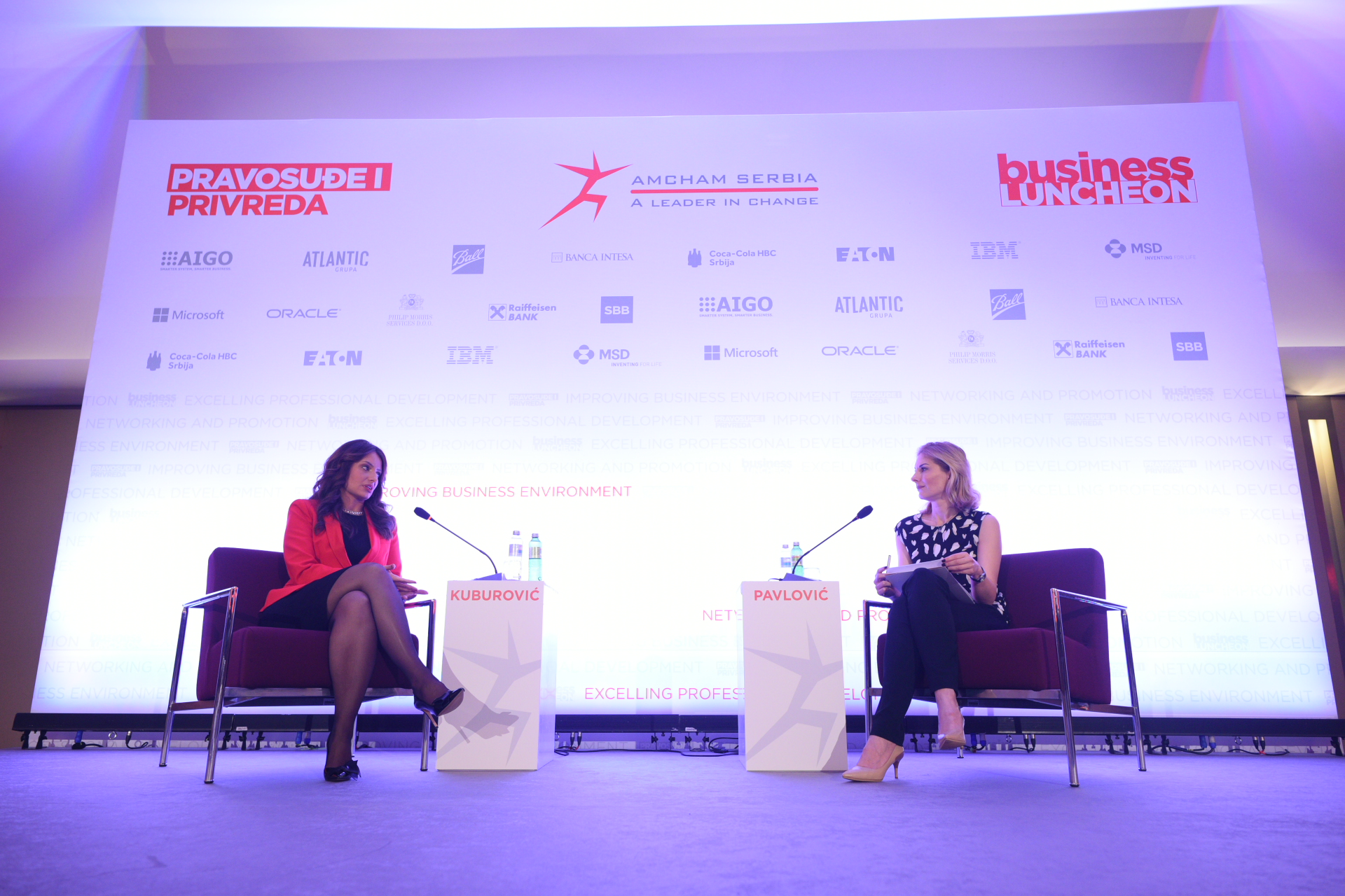 „Godišnje istraživanje o poverenju i zadovoljstvu investitora, koje AmCham već šestu godinu za redom sprovodi među svojim članicama, pokazuje da se pravosuđe i vladavina prava nalaze na prvom mestu prioriteta za unapređenje poslovnog okruženja“, rekla je Jelena Pavlović, predsednica Američke privredne komore na poslovnom ručku sa ministarkom pravde Nelom Kuburović.