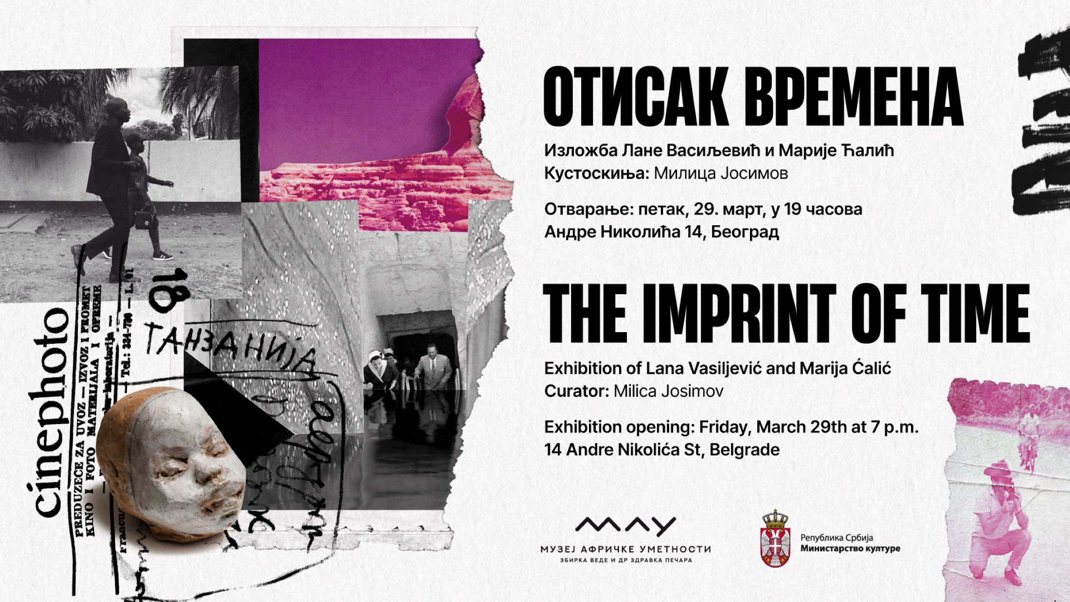 Trenutno u MAU možete pogledati novu tematsku izložbu „Otisak vremena“ umetnica Lane Vasiljević i Marije Ćalić, čiji je kustos Milica Josimov. Polazište izložbe za obe umetnice je arhiva – jedna institucionala, muzejska arhiva Pečar, a druga lična/porodična. Tokom čitavog aprila, svake nedelje u 11 časova (7, 14, 21. i 28. aprila) biće organizovana autorska i stručna vođenja kroz izložbu za odrasle posetioce, dok će za decu uzrasta od 6 do 12 godina biti priređena kreativna radionica „Scenografija mog putovanja“, na kojoj će deca kombinovanjem i kompozicijom crteža i kolaža u jedinstvenu celinu osmisliti scenografiju koja će predstaviti njihova stvarna ili izmaštana putovanja u Afriku.