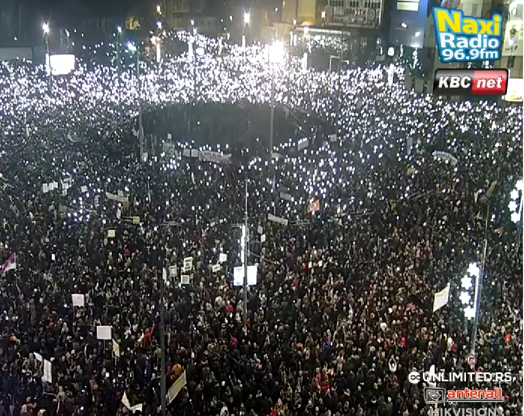 Na trgu Slavija je okupljen veliki broj ljudi, prema procenama reportera, u pitanju je više desetina hiljada učesnika.