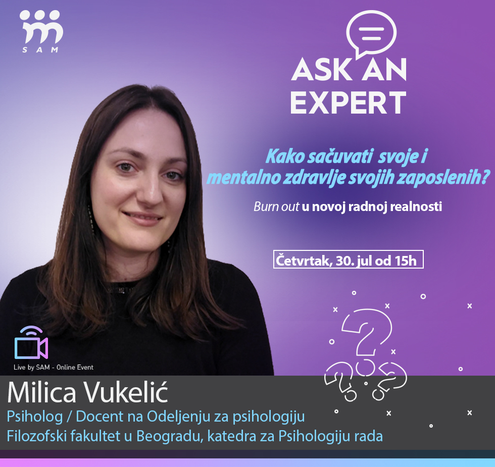 Srpska asocijacija menadžera poziva vas da prisustvujete novom izdanju online formata „Ask an Expert“ koje će biti posvećeno izazovima, savetima i preporukama kako da sačuvamo mentalno zdravlje u novoj realnosti. Na ovu goruću temu govoriće psiholog Milica Vukelić, docent na Odeljenju za psihologiju Filozofskog fakulteta u Beogradu u četvrtak, 30. jula od 15 časova. Razgovor sa Milicom Vukelić vodiće Jelena Bulatović, izvršna direktorka SAM-a.