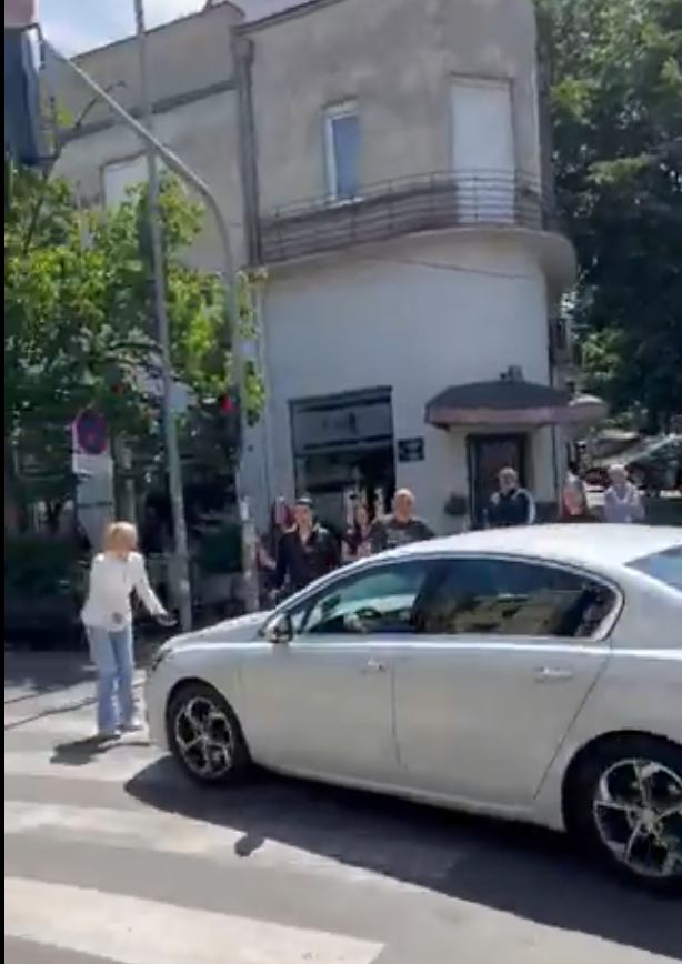 Na snimku se vidi kako građani zaustavljaju automobil čiji vozač ne reaguje na uzvike u okolini i probija se kroz masu.