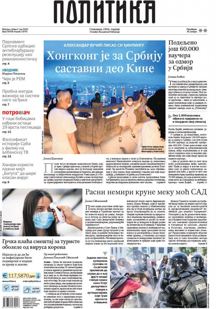 Beogradski dnevnik “Politka” piše da je Vučić to pismo poslao povodom zakona o nacionalnoj bezbednosti za specijalni administrativni region Hongkong, koji je Nacionalni kongres – parlament Kine usvojio prošle nedelje.
