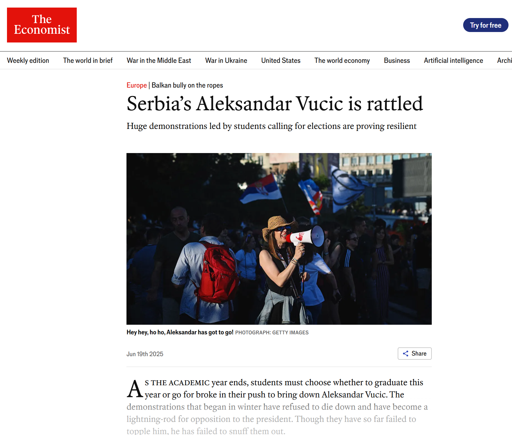 Višemesečne masovne demonstracije predvođene studentima, koje se pokazuju kao veoma otporne, duboko su uzdrmale predsednika Srbije Aleksandra Vučića koji vlada zemljom od 2012. godine, ocenjuje britanski nedeljnik Ekonomist.
