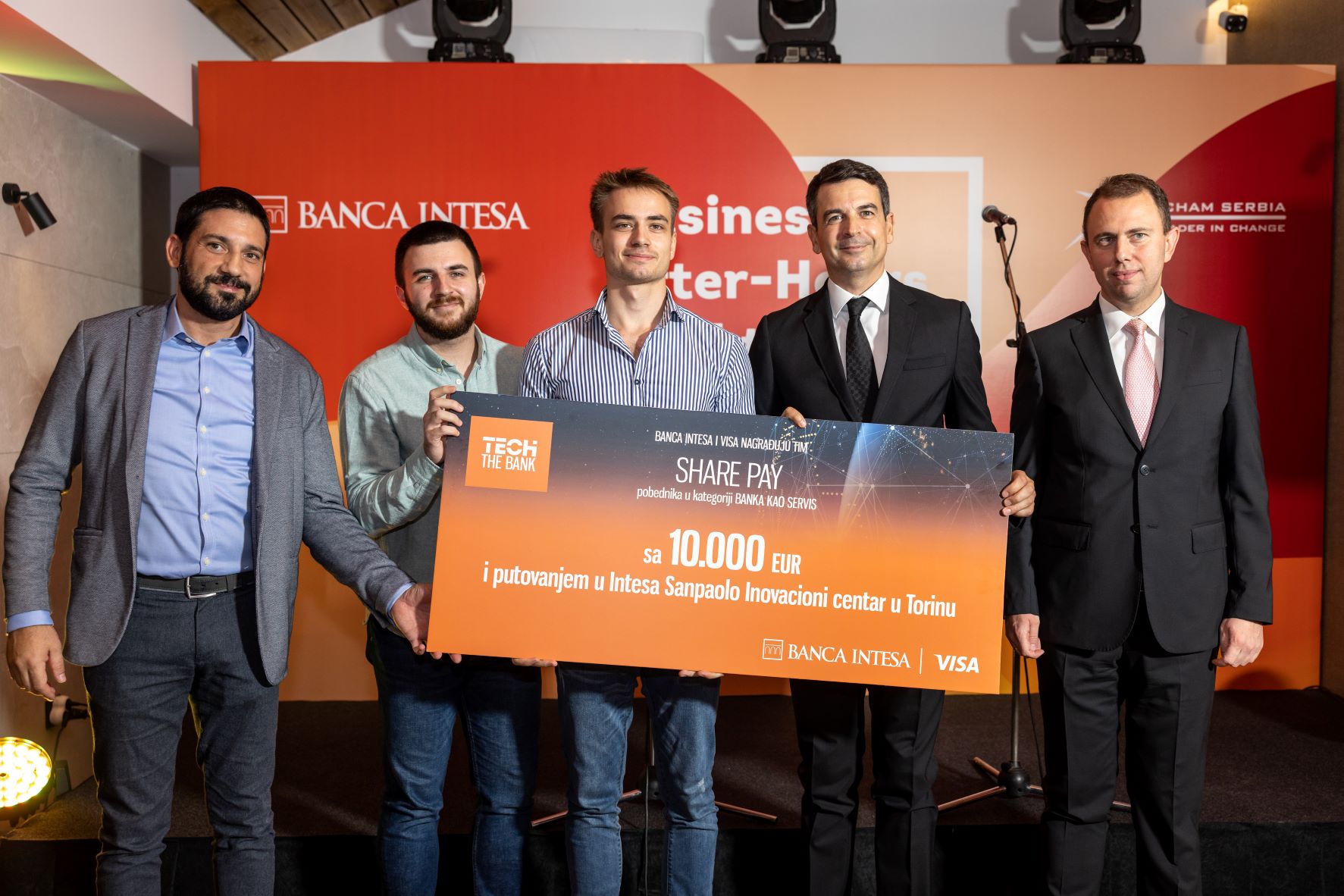 Banca Intesa, članica Intesa Sanpaolo grupe, svečano je dodelila nagrade pobednicima digitalnog konkursa Tech the Bank na Business After-Hours koktelu, koji je organizovala u saradnji sa Američkom privrednom komorom u Srbiji. Na događaju koji je održan u sredu 28. septembra u Golf klubu Ada na Adi Ciganliji, Darko Popović, predsednik Izvršnog odbora Banca Intesa, Stefan Lazarević, predsednik Upravnog odbora Američke privredne komore Srbije i Srđan Dakić, Business Development lider u kompaniji Visa za region Jugoistočne Evrope, pobedničkim timovima, Humanitarko, Cropt i Share Pay, uručili su nagrade od 10.000 evra, kao i studijsko putovanje u Inovacioni Centar Intesa Sanpaolo u Torinu.
