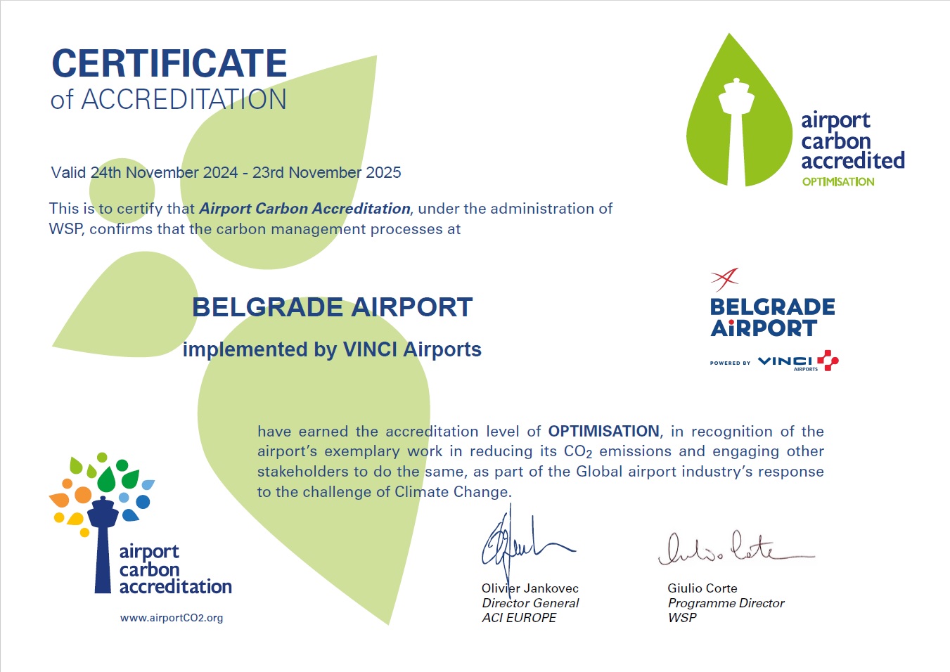 Aerodrom Nikola Tesla Beograd, kojim upravlja kompanija Belgrade Airport, deo mreže VINCI Airports, dostigao je nivo 3 u programu akreditacije za smanjenje ugljeničnog otiska aerodroma (ACA) Međunarodnog saveta aerodroma (ACI), čime su prepoznati napori aerodroma u smanjenju emisije CO₂ i potvrđena efikasnost strategije zaštite životne sredine razvijene na beogradskom aerodromu.
