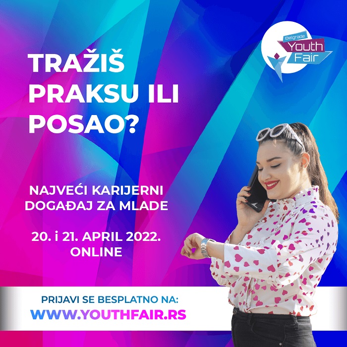 U Srbiji će se 20. i 21. aprila održati osmi po redu Belgrade Youth Fair, najveći karijerni događaj u regionu. I ove godine će biti organizovan u interaktivnom online formatu, a mladi će imati priliku da se povežu sa mnogobrojnim poslodavcima i tako sebi obezbede praksu ili zaposlenje, ali i steknu mnogobrojna znanja za koja će dobiti besplatan sertifikat. Program će trajati od 10 do 17 časova, a činiće ga sajamski i konferencijski deo.
