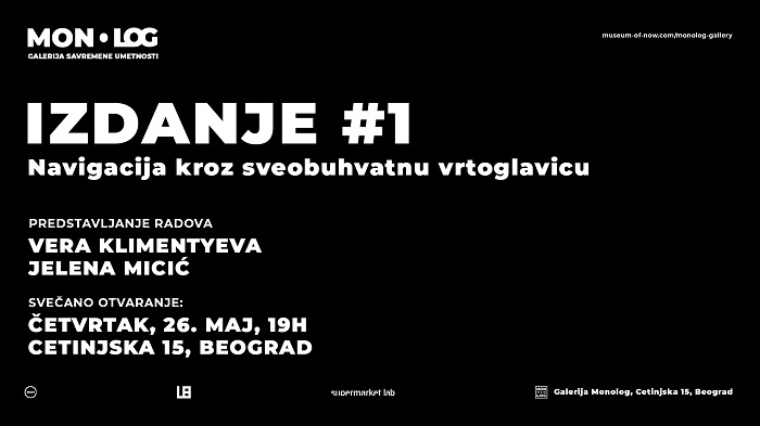 U četvrtak, 26. maja sa početkom u 19h, u Cetinjskoj 15 u Beogradu, zajedničkom izložbom umetnica Jelene Micić iz Srbije i Vere Klimentjeve iz Rusije pod nazivom “Navigacija kroz sveobuhvatnu vrtoglavicu“ biće otvorena nova galerija savremene umetnosti u Beogradu – Galerija Monolog, prostor koji će predstavljati sponu između umetnika, kreativaca i stvaralaca Beograda i Berlina.