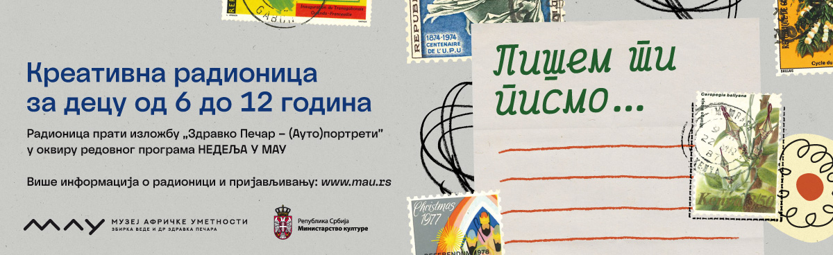 Pored čuvanja, obrade i izlaganja predmeta afričkih kultura i umetnosti, Muzej afričke umetnosti poseduje i dragocenu arhivu – beleške, pisma, razglednice, fotografije i druge vidove dokumentarne građe, koja je nastala tokom putovanja osnivača muzeja Vede Zagorac i Zdravka Pečara u Afriku. Na radionici „Pišem ti pismo” koja je inspirisana aktuelnom izložbom deca će imati zadatak da napišu pismo, koje, u skladu sa sadržajem može biti i ukrašeno, a tokom programa upoznaće se sa strukturom pisanja pisma, pravilnim načinom adresovanja koverte i slanja poštom. Kombinovanjem teksta, crteža, kolaža i isečaka iz novina, cilj radionice je da deca napišu dva pisma: jedno pismo, koje će ubaciti u poštansko sanduče Muzeja, i drugo pismo, koje će pokloniti, ili poslati nekoj dragoj osobi. Radionice vode: Aleksandra Gačić, kustoskinja, i Bojana Maričić, saradnica MAU.