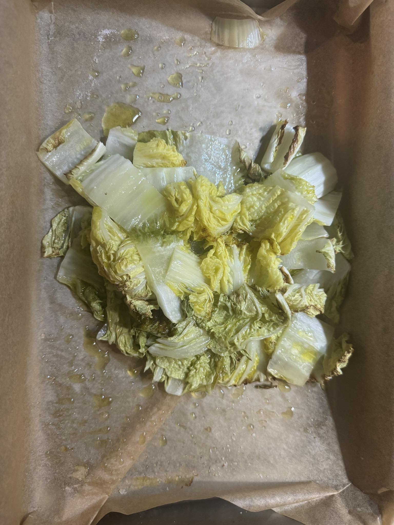 Bukovače i isečeni kineski kupus prelijte maslinovim uljem i malo soli. Pecite na 200 stepeni oko 20 minuta.