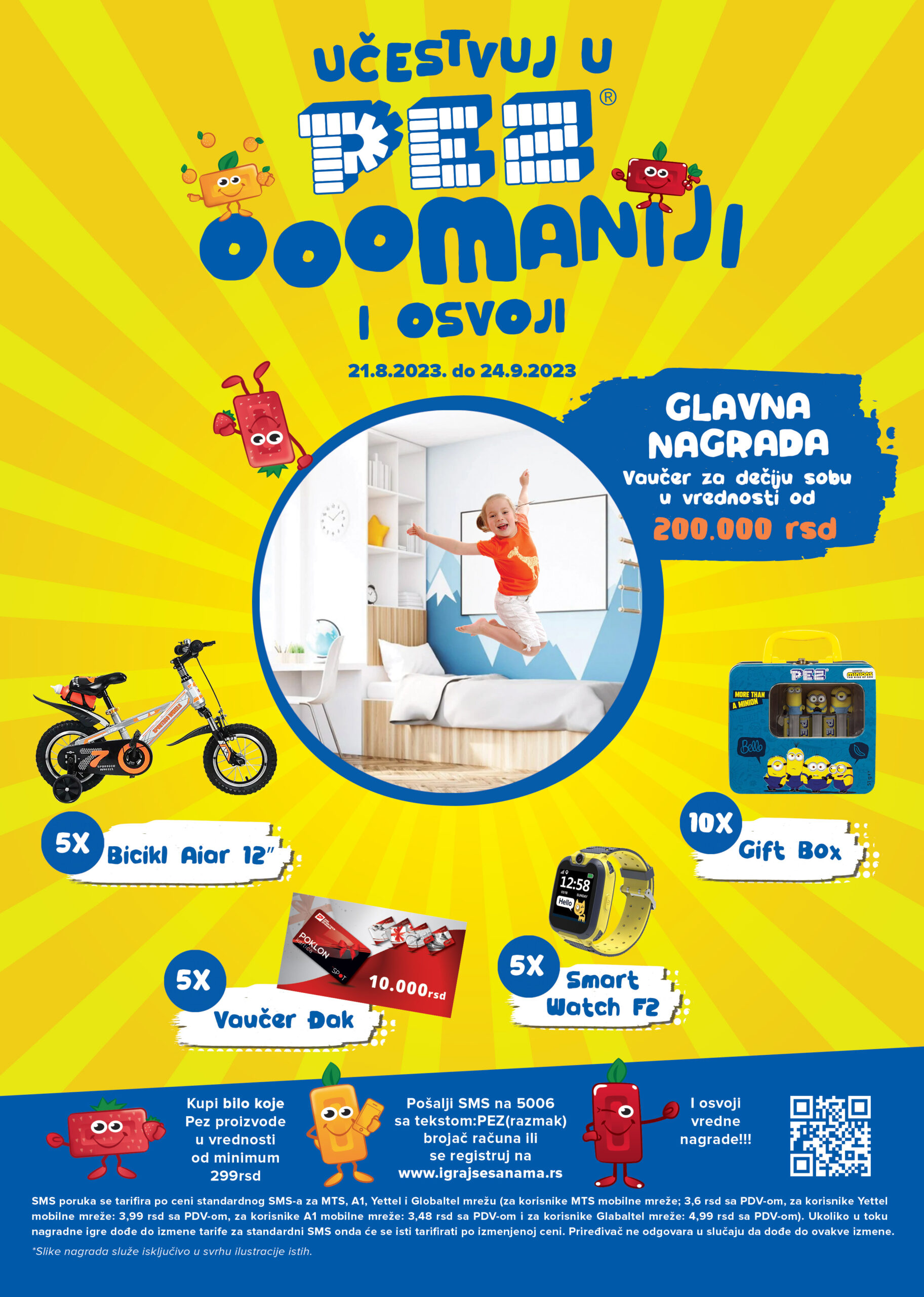 Uz samo malo osmeha i kupovinu bilo kojeg PEZ proizvoda u vrednosti od 299 dinara na jednom računu, u periodu od 21.8.2023. do 24.9.2023. godine, prijavite se i očekujte vredne nagrade. Sve što je potrebno da biste učestvovali jeste da pošaljete SMS na broj 5006 sa sadržajem: PEZ (razmak) broj računa, ili jednostavno ispunite formu na internet stranici www.igrajsesanama.rs.