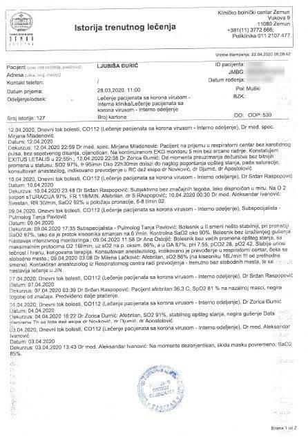 U bolničkom izveštaju za Ljubišu Đurića, čiju je kopiju dobila AFP, doktorka je napisala da je 9. aprila, 2020. godine u 3.08 “kontaktiran anesteziolog iz Respiratornog centra radi prevođenja – trenutno bez slobodnih mesta”. Prema istom izveštaju, druga doktorka je napisala da je u 11.58 “konsultovan anesteziolog, indikovano je prevođenje u respiratorni centar, čeka se slobodno mesto”.
