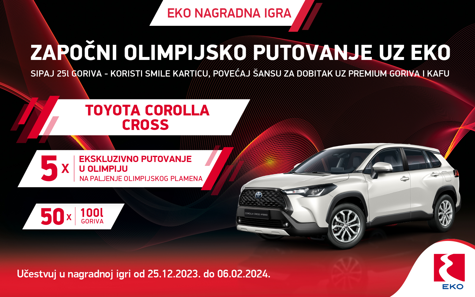 Uzbudljivo olimpijsko putovanje počinje uz nagradnu igru koja traje od 25. decembra do 06. februara, na svim EKO benzinskim stanicama. Tokom januara 2024. godine, svake srede (03.01, 10.01, 17.01, 24.01. i 31.01.) se izvlače dobitnici po jednog putovanja u Olimpiju i 10 dobitnika vaučera za kupovinu 100 litara goriva. Glavna nagrada automobil Toyota Corolla Cross biće izvučena 07. februara. Više informacija o nagradnoj igri mogu se pronaći na sajtu: www.ekoserbia.com ili pozivom besplatnog Call centra, na broj 0800 088 887.