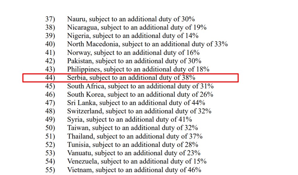 Interesantno je da u Aneksu III američke Uredbe o regulisanju uvoza stoji da carinska stopa za Srbiju iznosi 38 odsto, a ne 37 odsto – koliko je pisalo na jednoj od tabela koje je sam Tramp objavio na društvenim mrežama 2. aprila i koliko stoji u Aneksu I iste te američke Uredbe.
