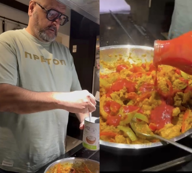 1. Propržite povrće. Dodajete malo bibera (Peppe koristi kajenski), po ukusu, a on voli da je ljuće pa dodaje više. Začinite karijem i kurkumom, promešajte i osetićete da je jelo već lepo zamirisalo