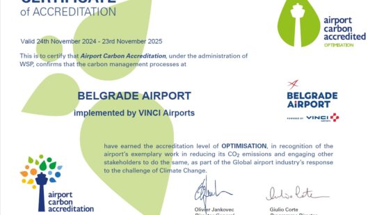 Belgrade Airport napreduje ka smanjenju emisija ugljenika i dostigao je nivo 3 u programu akreditacije za smanjenje ugljeničnog otiska aerodroma