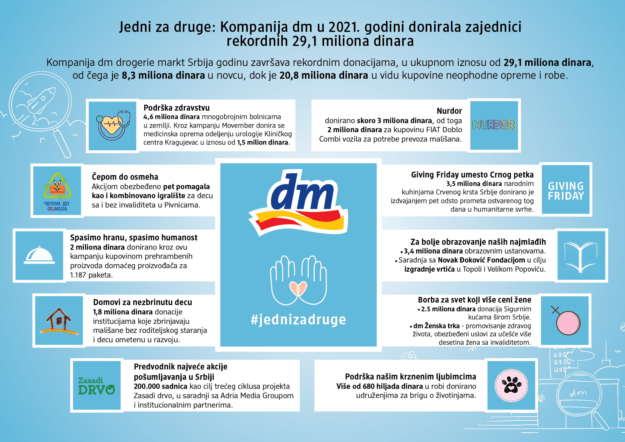 Biz news Jedni za druge: Kompanija dm u 2021. godini donirala zajednici rekordnih 29,1 miliona dinara Biznews