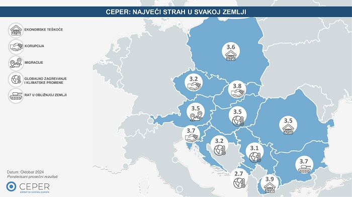 Najnovija studija CEPER-a, sprovedena u 12 zemalja širom regiona, Barometar straha 2024, otkriva najveće brige stanovništva Centralne Evrope. Najveću zabrinutost izazivaju klimatske promene i globalno zagrevanje – ova pitanja identifikovana su kao najzabrinjavajuća u četiri zemlje: Mađarskoj (3,55), Hrvatskoj (3,18), Srbiji (3,13), kao i u Crnoj Gori (2,75).