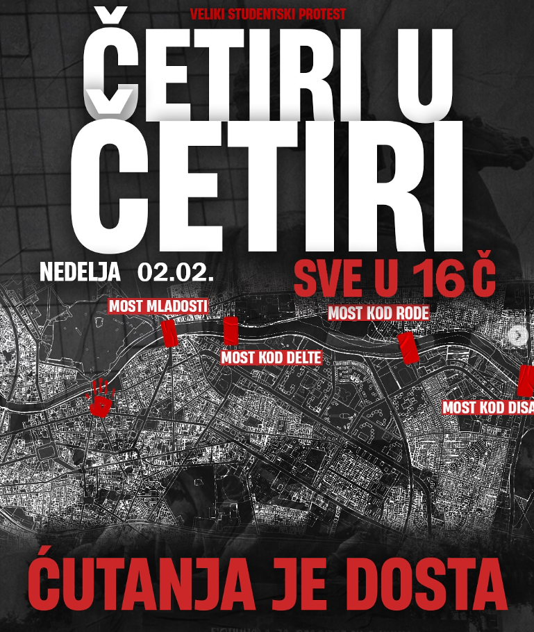 Niški studenti pozvali su na protest pod nazivom “4 u 4 sve u 16” , sutra, u nedelju, 2. februara, sa početkom u 16 časova.