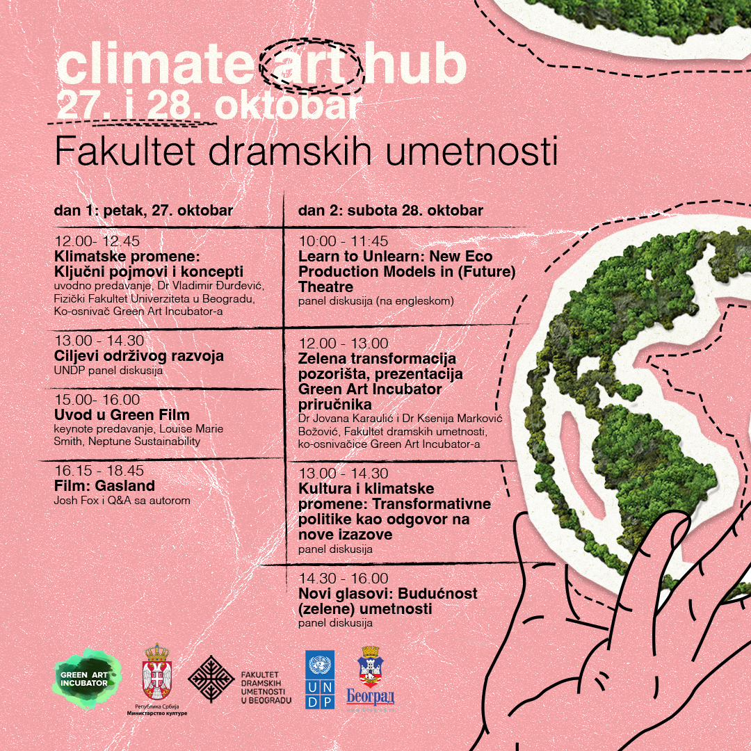 Klimatske promene, kao dugoročni i jedan od najvećih izazova savremenog društva, nameću pitanje njegove sveobuhvatne transformacije u odnosu na nove uslove, pa tako i polja kulture i umetnosti. Tema zelene tranzicije u kulturi, sve je prisutnija u javnom diskursu, a šta sve podrazumeva prelazak na ekološki održive modele umetničke produkcije, imaćete priliku da saznate na dvodnevnom međunarodnom događaju- Climate Art Hub, u organizaciji platforme Green Art Incubator, a u saradnji sa Fakultetom dramskih umetnosti u Beogradu i UNDP Srbija.