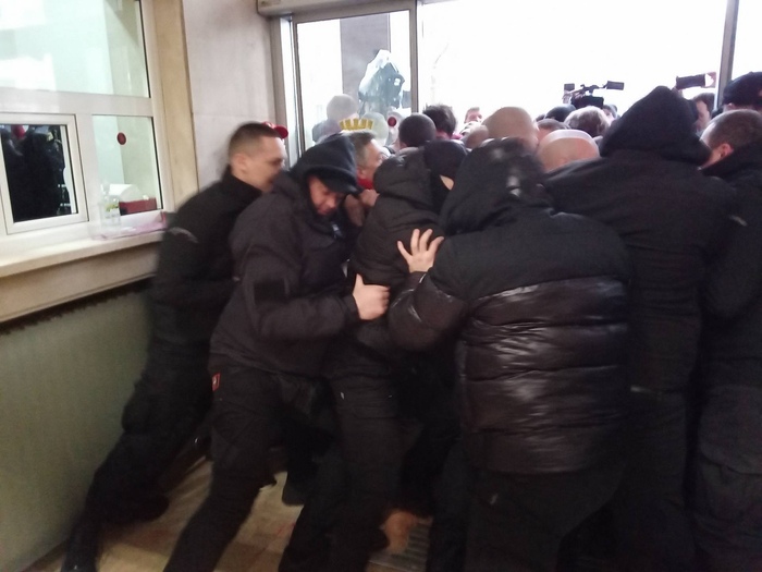 Do guranja je došlo kada su neki od aktivista predvođeni Miketićem pokušali da uđu u zgradu, noseći veliki transperent sa crvenom šakom.