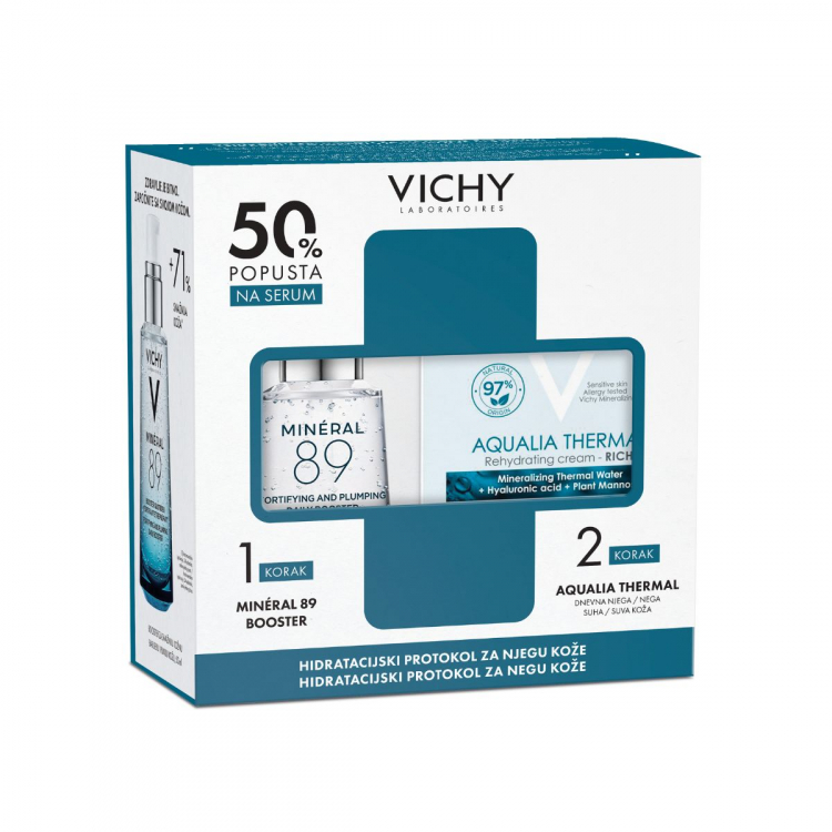Verzija 4: Mineral 89 je hidratacijski protokol za negu kože koji čini: čuveni Vichy Mineral 89 booster koji ojačava kožnu barijeru, popunjava i osnažuje kožu pružajući joj dubinsku hidrataciju i Aqualia Thermal krema za kožu koja je hidrirana do 48h i ojačana čak i u uslovima klimatskih promena, stresa i zagađenja.