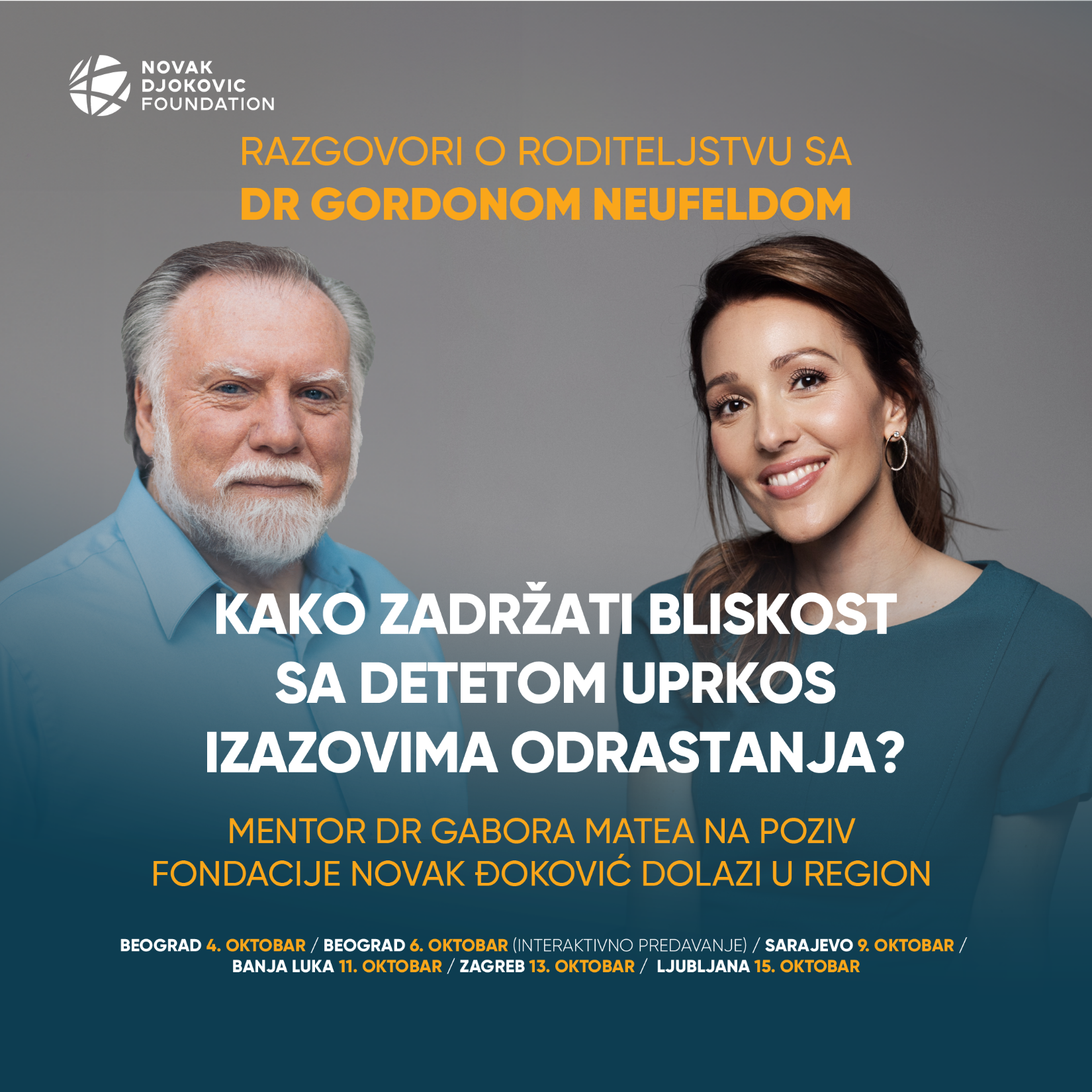 Ovo su samo neke od poruka koje je dr Gordon Njufeld, eminentni stručnjak iz oblasti razvojne psihologije sa preko 40 godina iskustva, podelio u svom razgovoru sa Jelenom Đoković, suosnivačicom i globalnom direktorkom Fondacije Novak Đoković. Upravo u organizaciji Fondacije Novak Đoković, dr Njufeld posetiće nekoliko gradova regiona tokom prve polovine oktobra i sa publikom razgovarati na temu „Kako zadržati bliskost sa decom uprkos izazovima odrastanja?“, a seriju ovih razgovora započeće u Beogradu, ovog petka, 4. oktobra, događajem u MTS Dvorani.