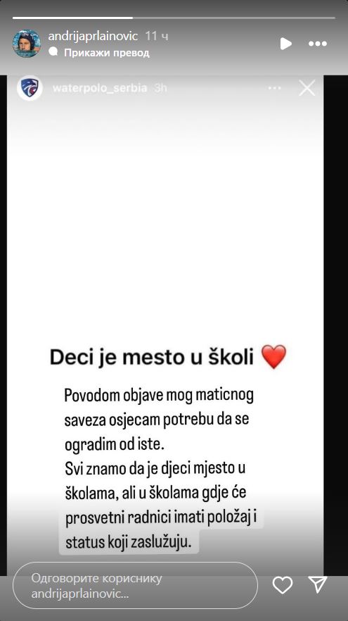 Prethodno je Vaterpolo savez Srbije na istoj mreži podelio kratku poruku „Deci je mesto u školi!“ uz emotikon srca, a na sliku istog tog „storija“ Prlainović je nalepio svoj komentar i podelio ga.